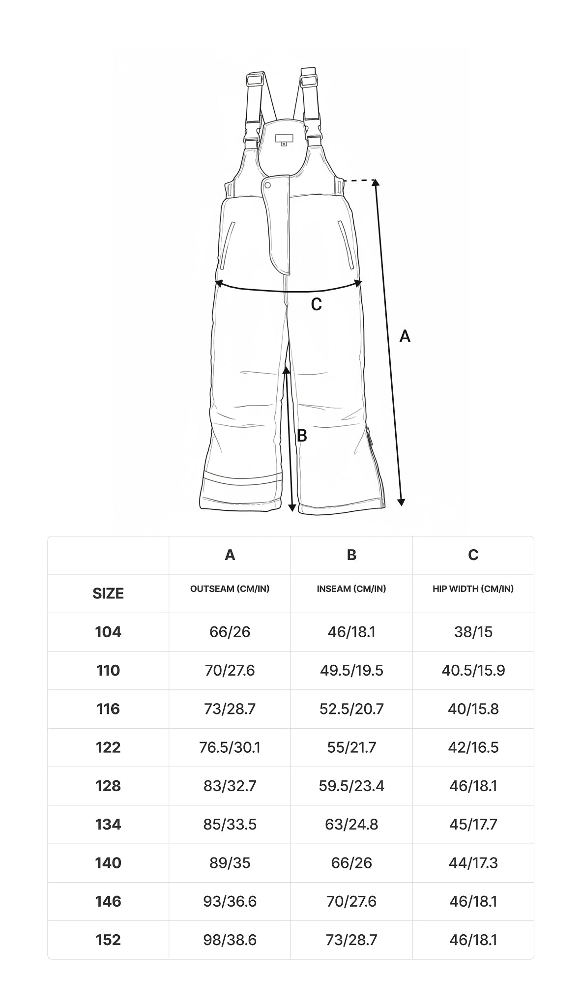 Inteligentne detale konstrukcyjne zwiększają praktyczność: zapinane na zamek otwory u dołu nogawek ułatwiają zakładanie na buty narciarskie, a regulowane elastyczne szelki zapewniają wygodne dopasowanie, które rośnie wraz z dzieckiem. Odblaskowe wykończenia poprawiają widoczność w słabym świetle, a trwałe zapięcia YKK® gwarantują długotrwałą wydajność.